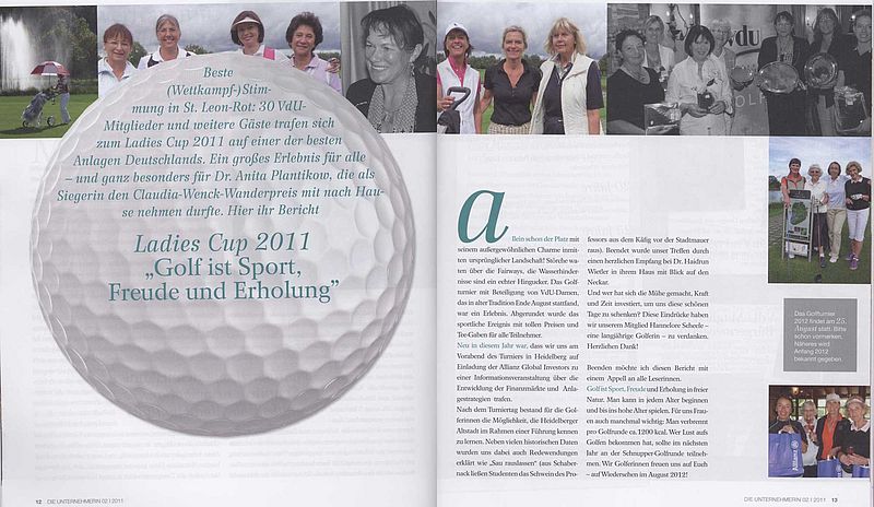 In der Ausgabe 02 / 2011 des Magazin's "Die Unternehmerinnen" wertet Frau Dr. Anita Plantikow, Mitglied des Landesvorstandes Mecklenburg Vorpommern, den Ladies Cup 2011 des Verband der Unternehmerinnen in St. Leon-Rot aus.